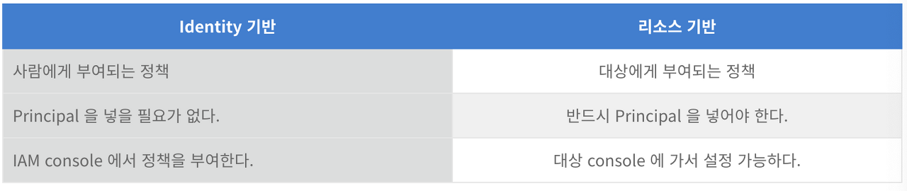 identity 기반 정책인 정의된 정책들을 유저에게 부여했다면 리소스 기반 정책은 해당하는 대상에 직접 정의해야 한다.