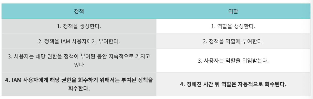 역할을 사용하게 되면 정책을 부여하는 방식과 권한을 따로 회수하지 않아도 되는 장점이 있다. 예를 들어 s3 버킷에 파일 하나를 업로드하려 할 때 s3 버킷 쓰기 역할을 위임받은 후 필요한 작업을 완료하면 된다. 1시간이 지난 후 자동으로 역할에서 해제된다.