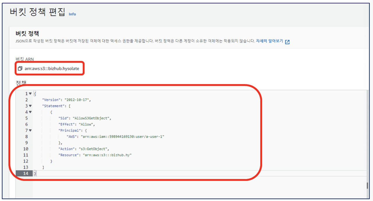 위 정책은 “bizhub.hy 라는 S3 버킷에 읽기 권한을 계정 123456789 의 a-user-1 에게 부여함” 이라는 정책이다.